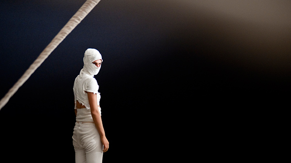 Waldmann’s West-Eastern labyrinth opens with a cobweb-like rope construction on stage, with a white bandaged cube, as tall as a man, at its centre, as if the nodal point of every social vibration were disabled. Drum rhythms emerge from within this box, and swell from a gentle, whispering pianissimo to a crashing din. In the meantime, the performers stroll along the thin line halfway between ecstasy and pain, repeatedly plunging into the deep void, into extinction. What Vania Rovisco and Yui Kawaguchi demonstrate may generate equally high levels of violence, but there will be one single point of arrival: the longed-for silence.