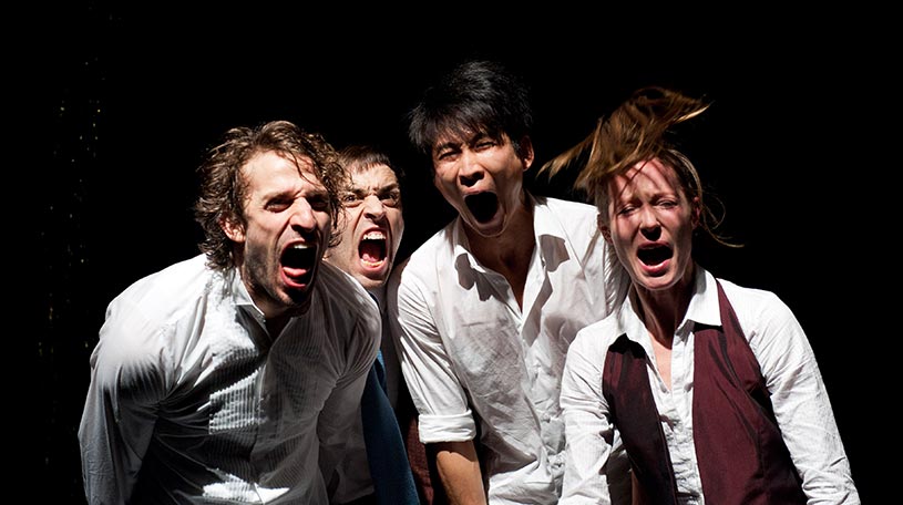 The ensemble, made up of three men and one woman, becomes increasingly restless and fidgety. Smiles give way to wary glances. The dancers have become grotesque happiness-puppets, the aggressive grimaces of a feel-good society that will chase after any promise of happiness. But why the relaxed mood changed is never fully revealed. Wasn’t enough enough? It was all so wonderful!