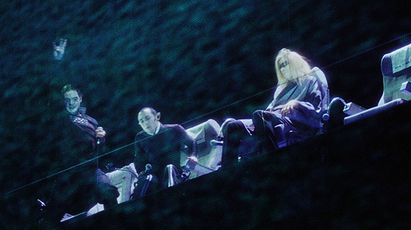 The immortals are seated up in the gods, the demigods refresh themselves half way up. Odysseus and his companions fight for survival at the foot of Olympus with virtual gameboy images behind them, projected on to a transparent screen in front of the three-floor stage.
